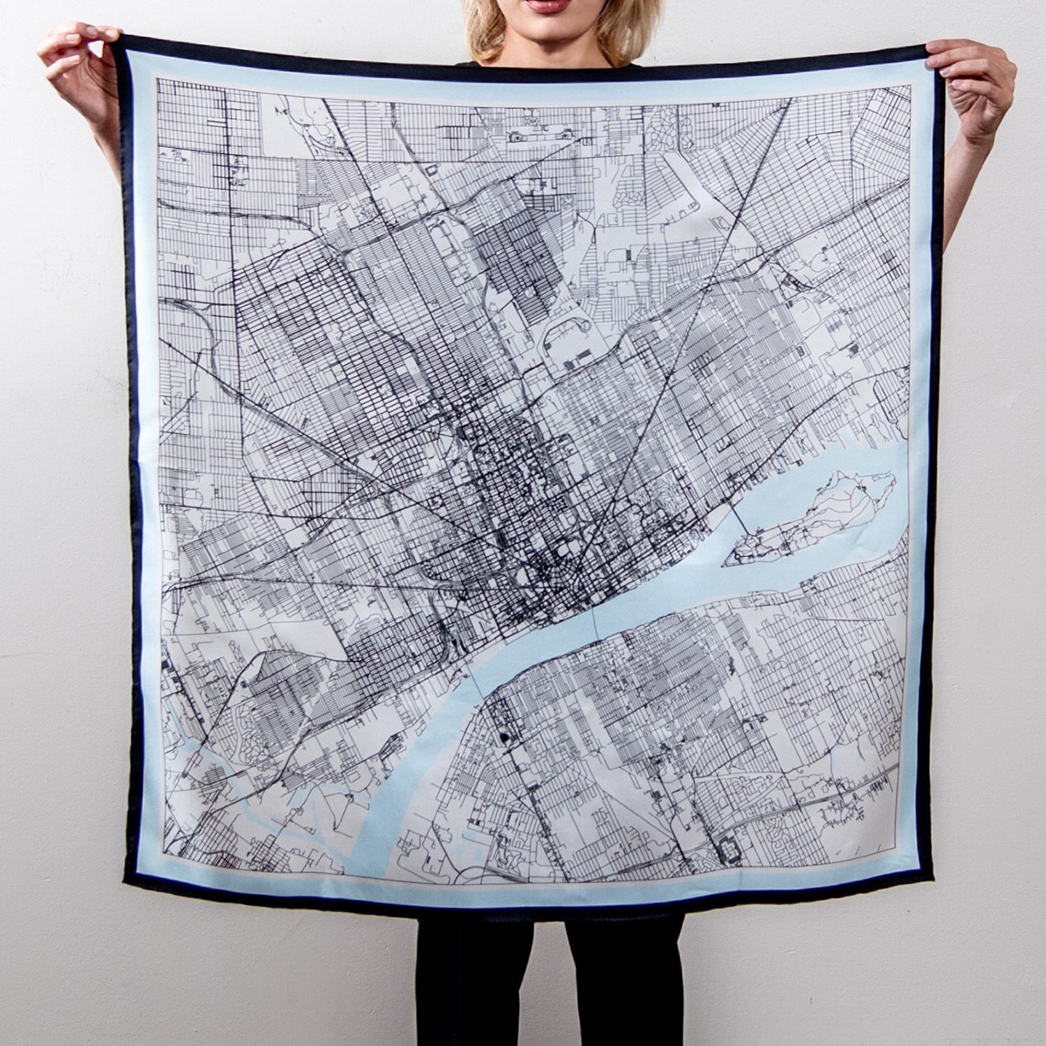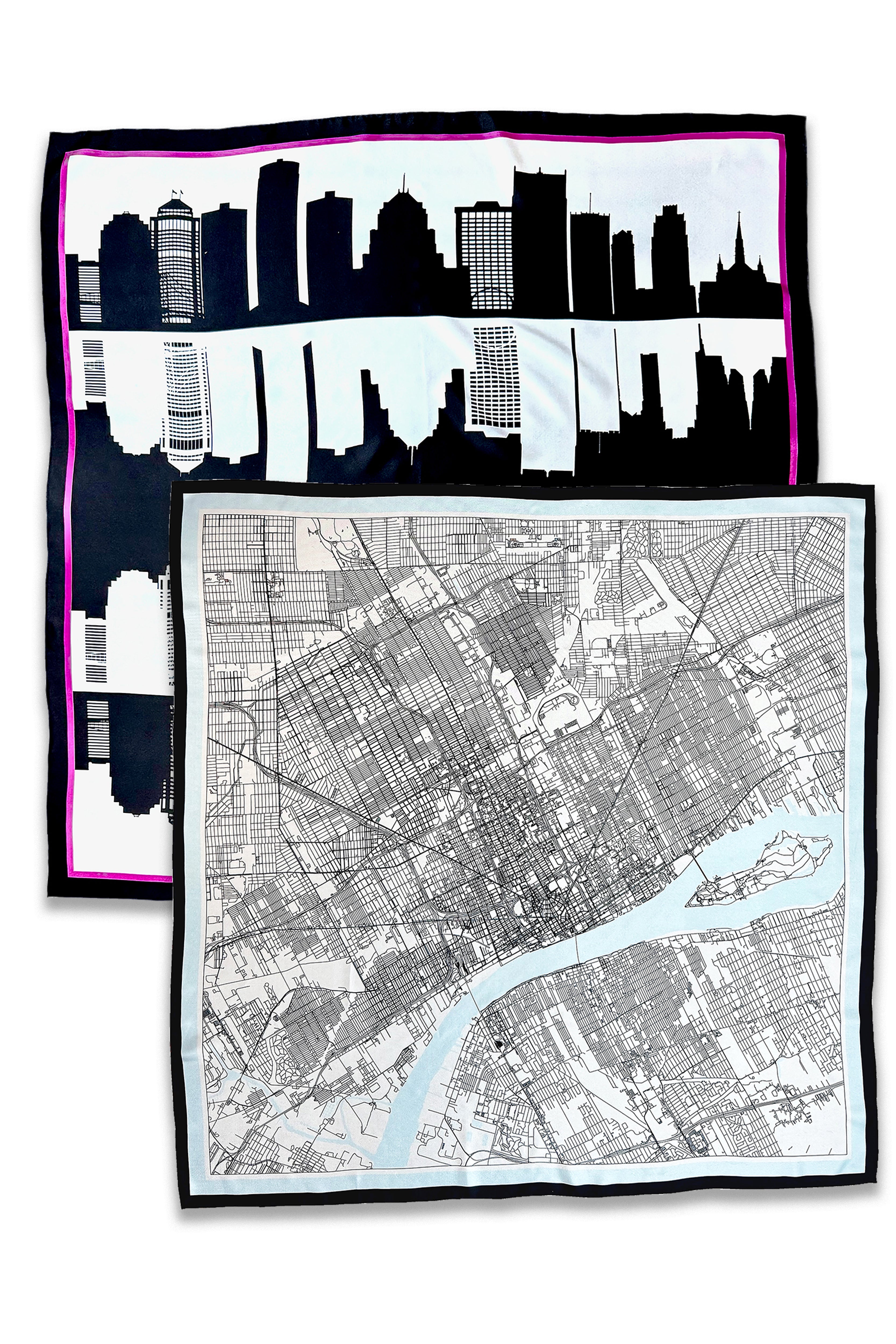 - 34" x 34" Double-sided Detroit City Map Silk scarf with hand-rolled hem