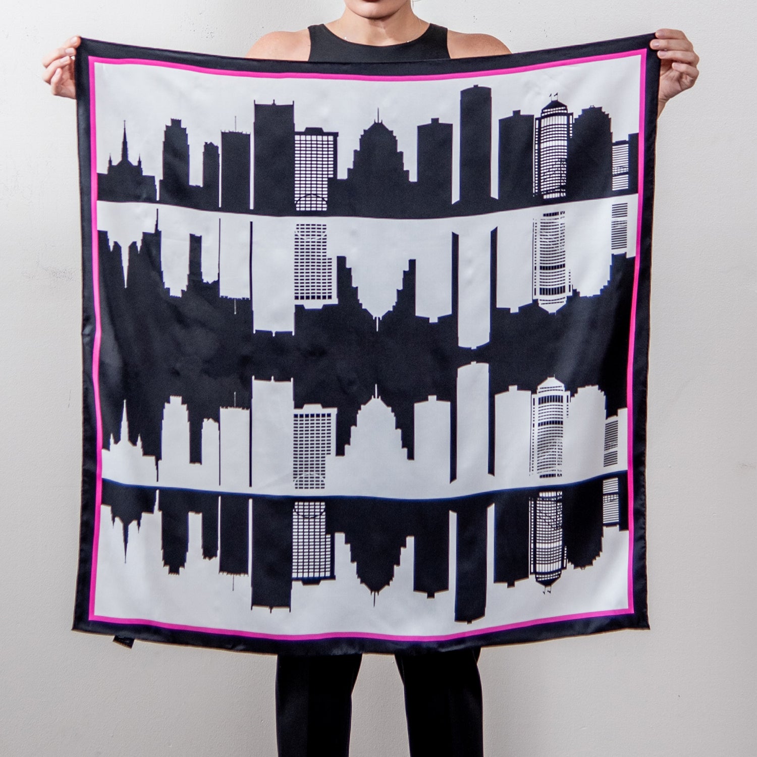 - 34" x 34" Double-sided Detroit Skyline scarf with hand-rolled hem