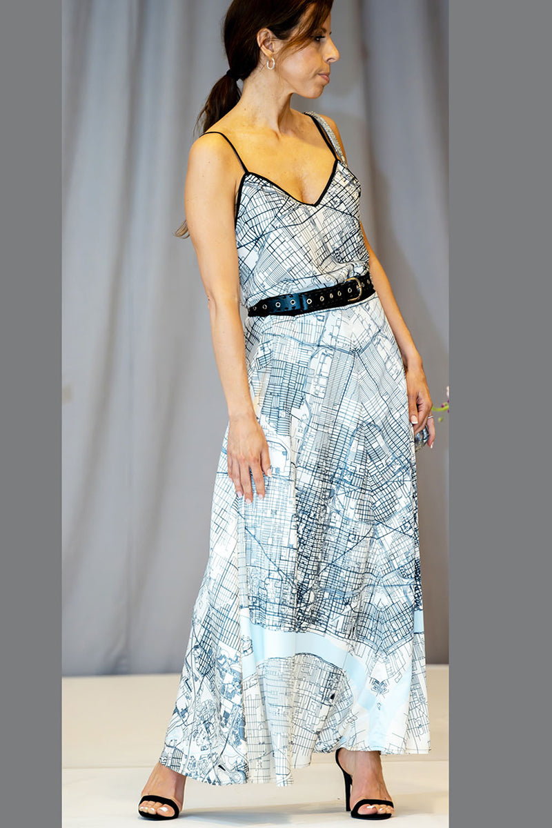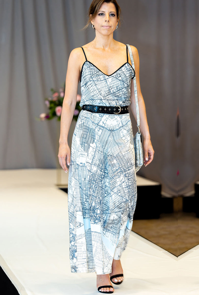 This city-inspired maxi skirt turns movement into art, with soft map detailing and a subtle hint of blue water. Silky, lightweight, and seasonless—it’s the statement piece you’ll reach for again and again, from day to night.